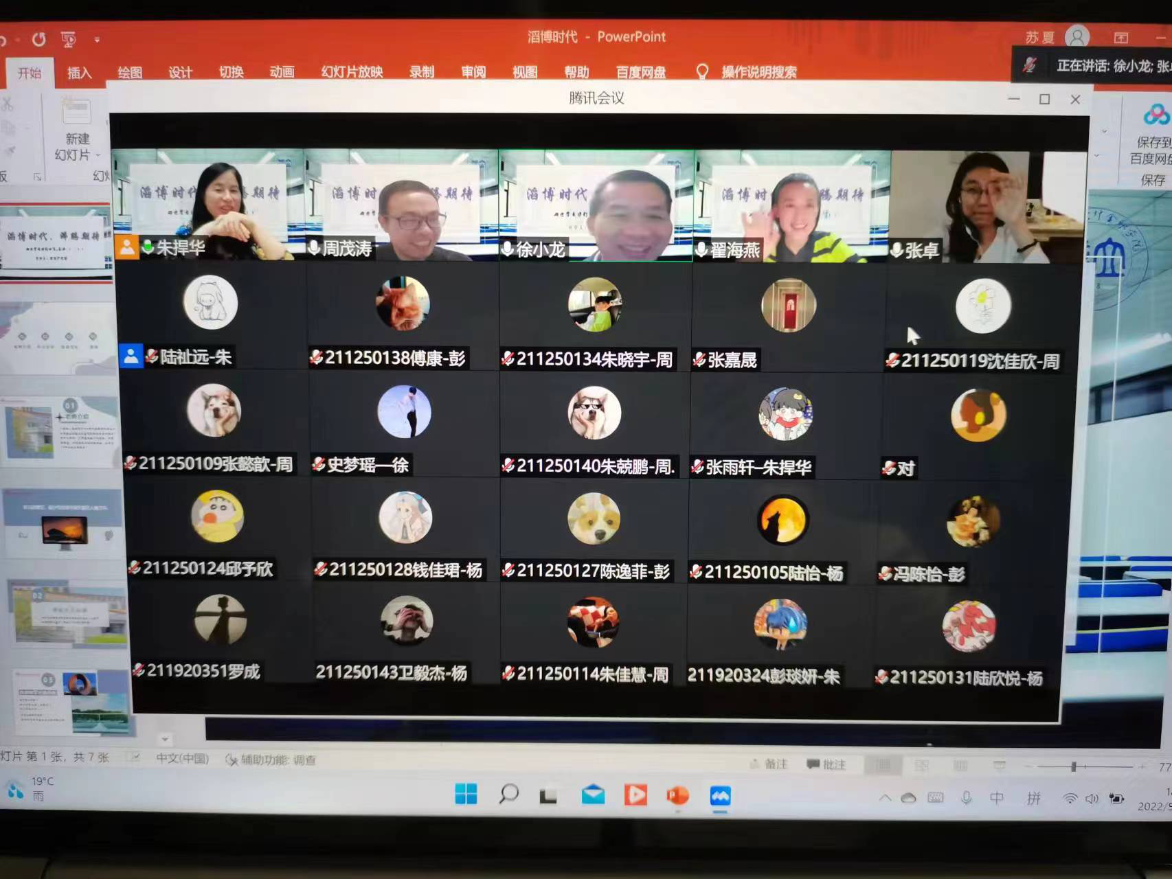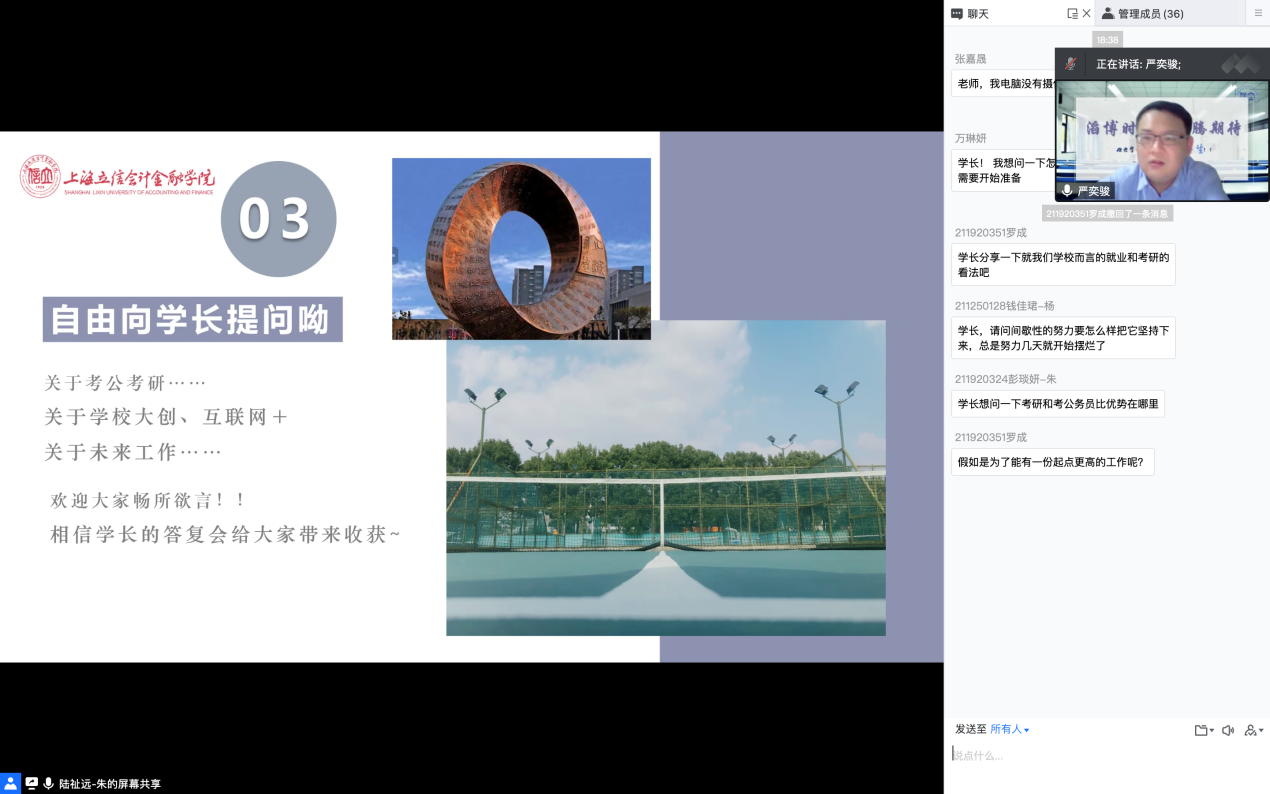 让学生成为研讨课的“中心”,是组织新生开展研讨的重要环节。朱老师提前两个星期就向同学们征集讨论话题、人生困惑和遇到的学习问题,并与主讲人沟通同学们的讲座需求和想法。陆祉远同学自告奋勇担任本次研讨课的主持,参与了研讨流程的策划,并在朱老师指导下精心制作了屏幕背景。研讨活动分为师生云上“叙旧”、学长分享和学生提问等三个部分。