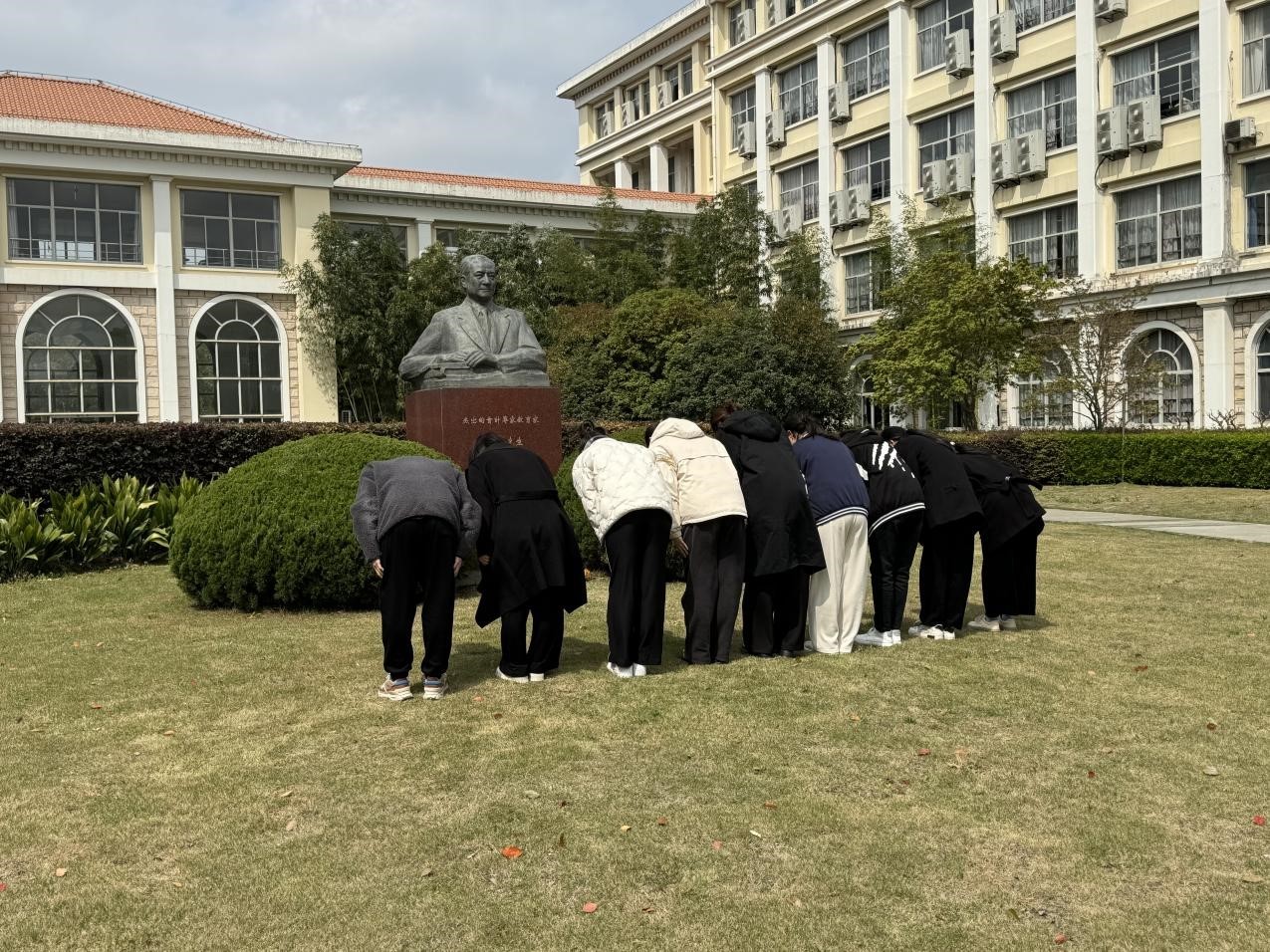 完成制作后,支部成员携带自己手工制作的菊花前往我校文翔路校区北碚楼潘序伦先生铜像前献花。临近清明,慎终追远,在潘老校长铜像前,全体成员向潘老铜像三鞠躬并默哀后,依次手持鲜花悄声缓步走向先生雕塑前摆放上菊花。仪式最后,支部书记王敏老师代表大家表达了对老校长深切的怀念和崇高的敬意,并勉励支部成员慕先哲之遗风,振吾辈之精神。