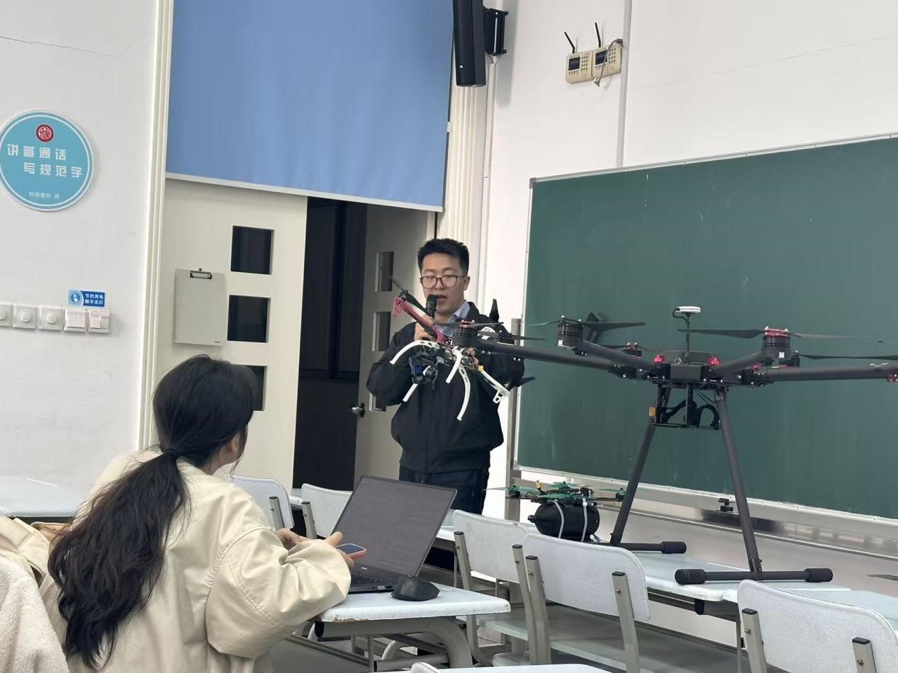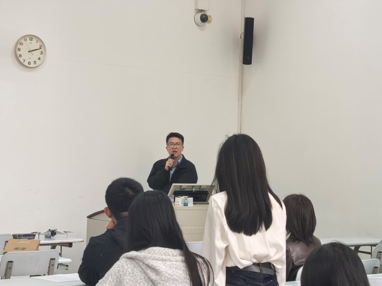王耀辉总监向学生们简要阐释了低空经济的核心概念,并携带了多款真机到场。现场展示的无人机涵盖了大疆迷你无人机、MPV穿越机、教学用可拆装无人机等型号,他对每款真机的核心特点进行了详细讲解。与此同时,王耀辉总监还拆解了无人机的应用场景,包括航拍表演、电力巡检、消防救援、物流配送、地理测绘、园区安防等领域。目前,外卖配送、空中出行等场景正逐步落地,民用无人机保有量已超200万架,产业规模突破1.5万亿元。
