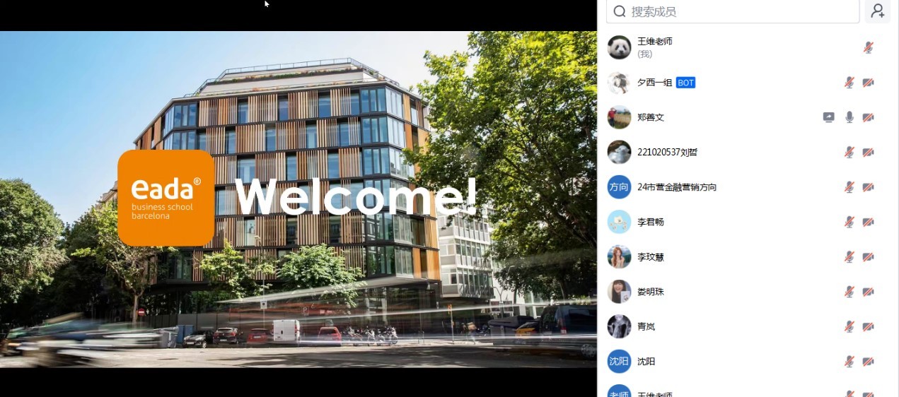 11月13日,为方便广大师生深入了解我校海外合作院校西班牙巴塞罗那高级金融管理学院(简称EADA)正在招生的硕士项目,解答同学们和家长关心的问题,学院特邀EADA中国招生处硕士项目招生负责人郑善文担任主讲嘉宾,通过腾讯会议平台举办线上宣讲会。会议由学院外事秘书王维主持,共有38名来自工商管理学院和会计学院同学及数位教师参加,大三大四的工商学生占比很大,表现出对此项目的浓厚兴趣。